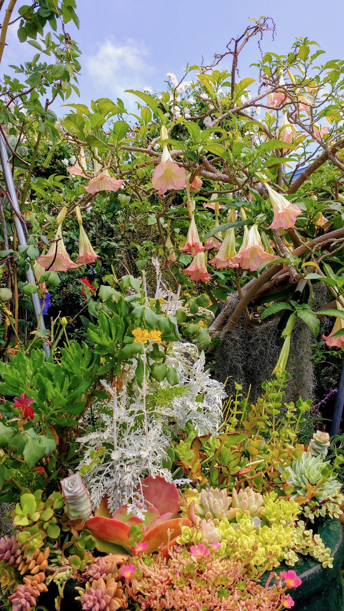 This is a wonderful presentation from R. Gale’s garden that is both deep and complex in color and texture. And the “messy-ness” only adds to the allure. Above is Brugmansia (trumpet flower, “Pink Angel”?) forming an umbrella over a bowl of mixed succulents. Look close and see what I else you can identify.